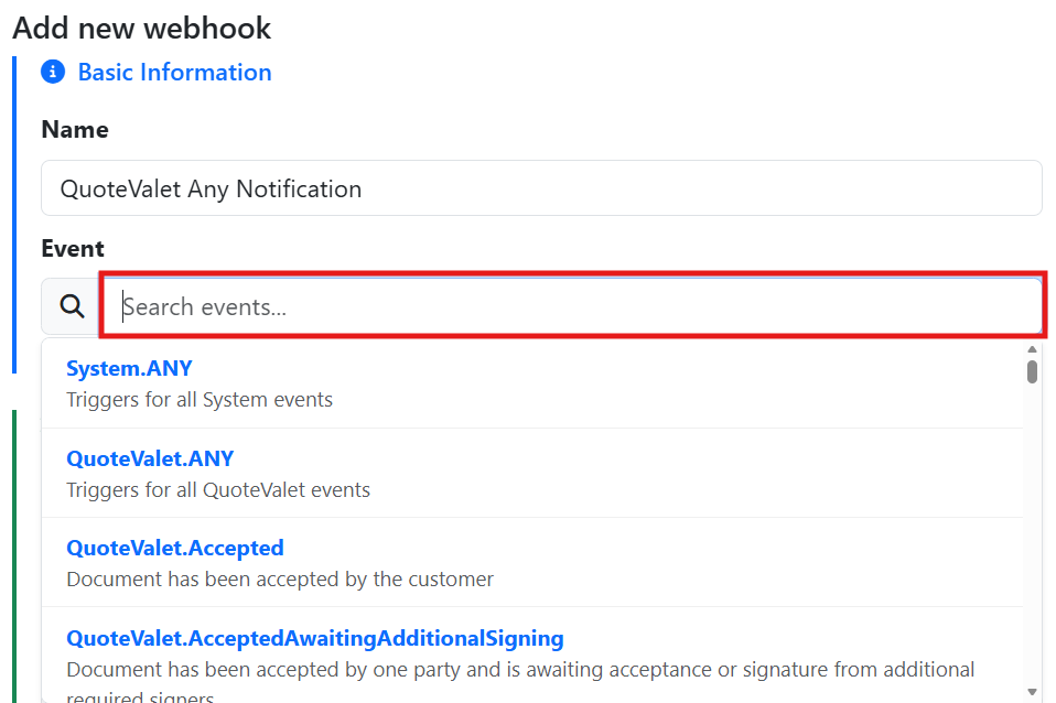 6. Choose the event that you would like to trigger your webhook by clicking into the box next to the magnifying glass icon under the event section. Note that under each event there is a description of what event is.