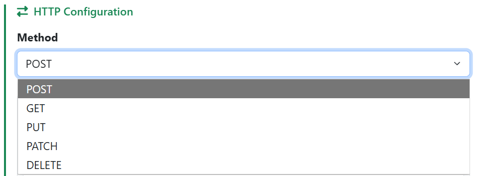 7. Under HTTP Configuration choose the method you would like your webhook to use. Most often this will be POST, but for a list and description of available methods click here.