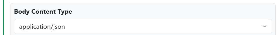 10. Choose the Body Content Type from the dropdown menu. In most cases this will be application/json, but there are other options should you wish to use them. For a list and description on Body Content Types click here.