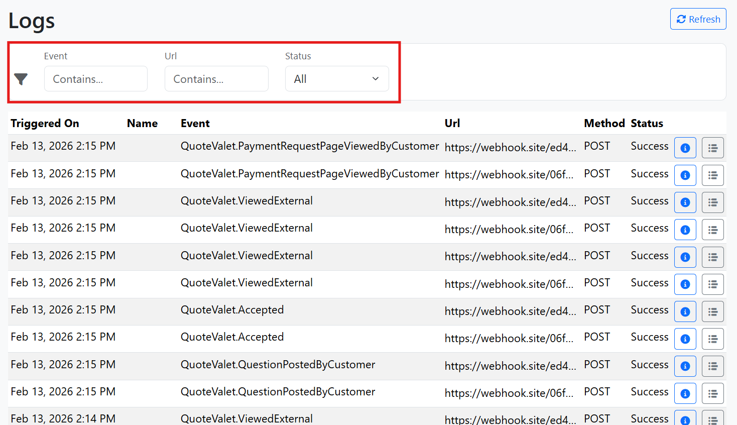 To view your Webhook logs click on Logs at the top of the Webhooks landing page.